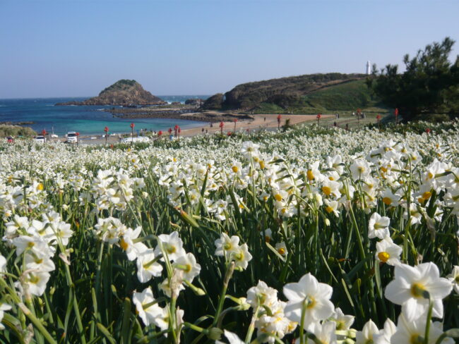爪木崎の岬が白く包まれる「下田温泉 水仙まつり」。澄んだ青い海と灯台を背景に、約300万本の野水仙がいっせいに咲き誇る光景は息をのむ美しさです◎海風にのって甘い香りが漂うなか、地元グルメや太鼓の演奏も…